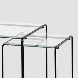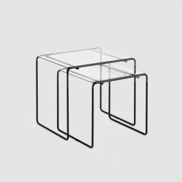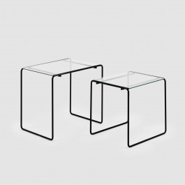 The light and transparent structure of these beautiful nesting side-tables consists of a steel rod structure in a black finish by which the two lightweight glass tops are supported. These tables pair beautifully with the Bertoia Wire Chairs.