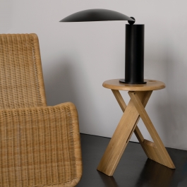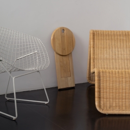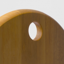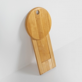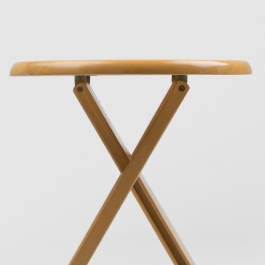 Suzy Stool designed by Adrian Reed 1985 and manufactured by Princes Design Works Ltd. is a foldable stool made from solid beech and featuring rubber hinges. The stool is comprised of three geometric shapes, two rectangles and one circle. When not in use, the stool can be easily folded into one flat shape, allowing for easy storage and transportation. A small hole in the seat allows for it to hang on the wall.